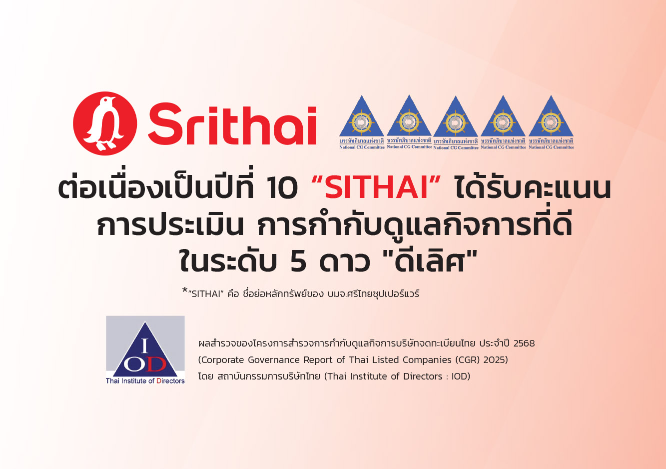 บริษัท ศรีไทยซุปเปอร์แวร์ จำกัด (มหาชน) (SITHAI) ประกาศความภาคภูมิใจอีกครั้ง หลังได้รับผลการประเมิน การกำกับดูแลกิจการบริษัทจดทะเบียนไทย (CGR) ประจำปี พ.ศ. 2568 ในระดับ 5 ดาว “ดีเลิศ (Excellent)” ต่อเนื่องเป็นปีที่ 10 จากสมาคมส่งเสริมสถาบันกรรมการบริษัทไทย (IOD) โดยได้รับการสนับสนุนจากตลาดหลักทรัพย์แห่งประเทศไทยศรีไทยซุปเปอร์แวร์ยึดมั่นในการดำเนินธุรกิจด้วยความโปร่งใส ตรวจสอบได้ และให้ความสำคัญต่อผู้มีส่วนได้เสียทุกกลุ่มอย่างเท่าเทียม รางวัลนี้จึงเป็นเครื่องยืนยันถึงการพัฒนาอย่างต่อเนื่องในด้านธรรมาภิบาล และการบริหารจัดการที่สอดคล้องกับหลัก ESG (Environment, Social, Governance) เพื่อมุ่งสู่การเติบโตอย่างยั่งยืนในระยะยาว
